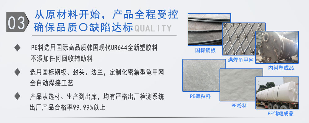 公司有鋼襯塑PE/PO、PE全塑、碳鋼、不銹鋼四大系列100多個(gè)品種,專注于常壓儲(chǔ)存容器生產(chǎn),其產(chǎn)品包括鋼襯塑儲(chǔ)罐、管口一體成型PE儲(chǔ)罐、碳鋼儲(chǔ)罐、不銹鋼儲(chǔ)罐、反應(yīng)釜、攪拌罐、離子交換柱、鋼襯PE/PO儲(chǔ)罐、塑料儲(chǔ)罐、鹽酸儲(chǔ)罐、硫酸儲(chǔ)罐等等。更大限度滿足廣大客戶的各種需求,同時(shí)可以根據(jù)客戶的需要加工定制各種防腐設(shè)備。